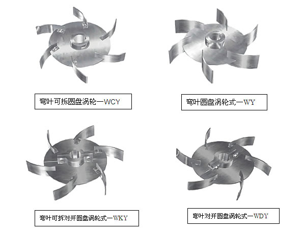 渦輪式攪拌器類似于無殼的離心泵,由圓盤、軸、及多塊葉片組成,結構復雜,種類較多,主要有開啟渦輪式和圓盤渦輪式兩種(見下圖)